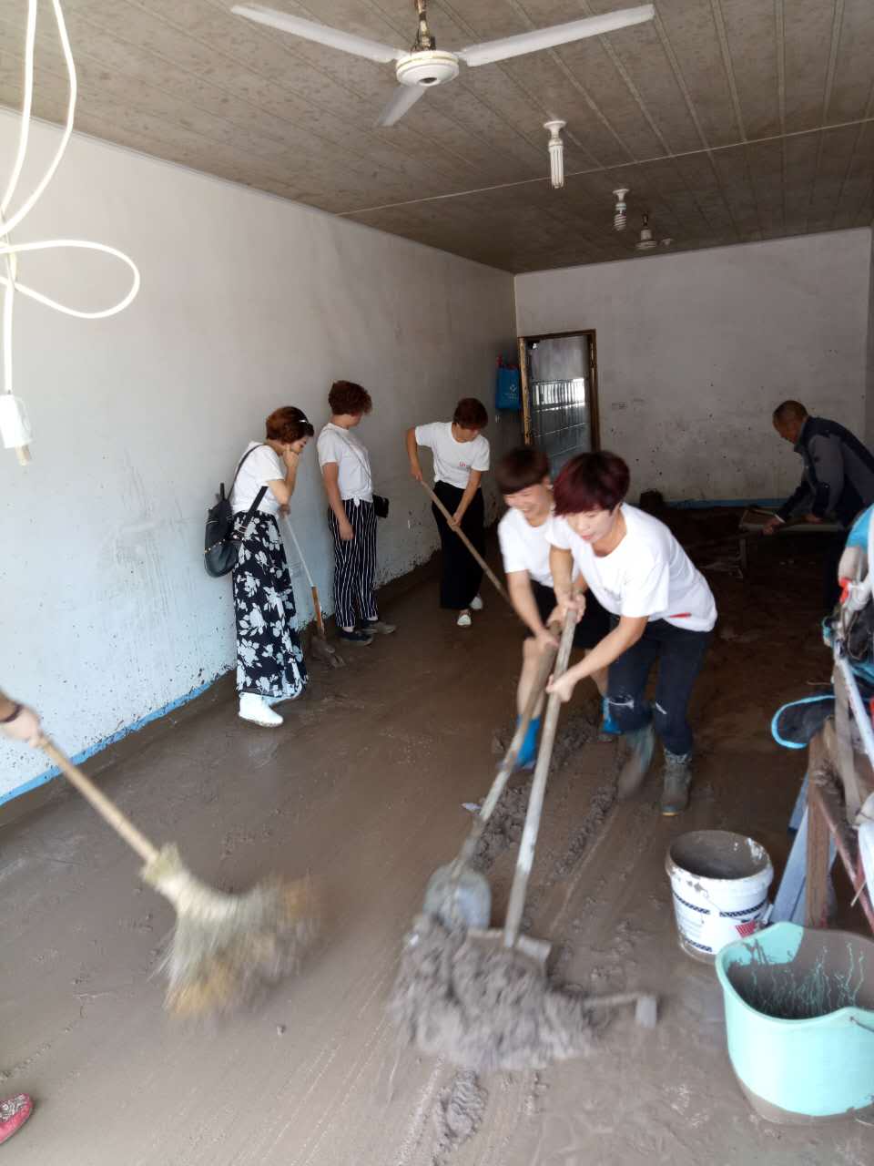 在此次愛心捐贈途中,小組成員們無意間看到一位70多歲的老爺爺,他正在清理家里地面上洪水沖過后留下的一層厚泥土,年邁的身體頗為吃力。見此情景,她們立即來到老爺爺家,拿起鐵鍬、掃帚等工具幫老爺爺打掃和處理家里的泥土。所有成員齊心協力、汗流浹背,半小時后將老爺爺家的地面收拾的一干二凈,老爺爺對浪莎家人的幫助非常感恩,連聲道謝。